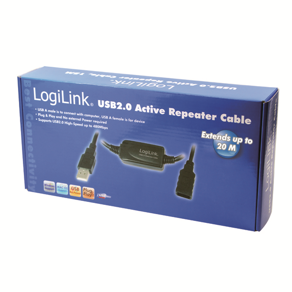 Logilink USB2.0 Repeater Kablo, USB sinyelleri maksimum mesafeye taşımak ve 480Mbps'e kadar veri aktarım hızını sağlamak için gelen sinyalleri yeniden oluşturan 20 metrelik aktif bir mesafe uzatma kablosudur.